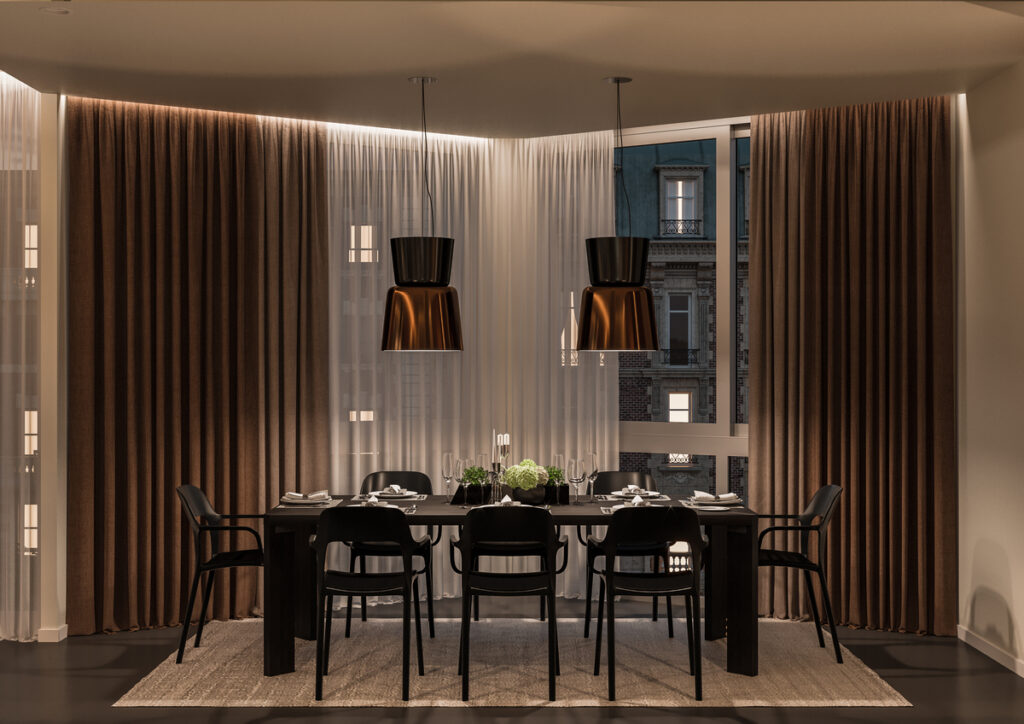 Lighting is crucial for creating the right ambiance and enhancing your dining room interior design. A stunning chandelier or pendant light can be the focal point of your dining room. Choose a fixture that complements the room’s decor—whether modern, traditional, or rustic.Install dimmer switches to control lighting levels, creating a cozy ambiance for intimate dinners or brighter lighting for family meals.